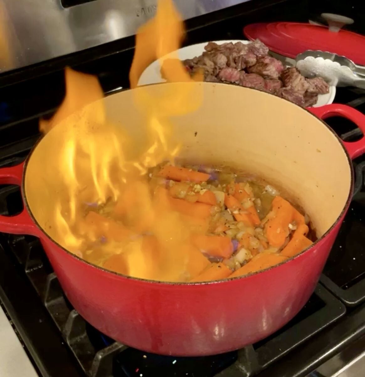 - Remove the seared cubes to the plate with the bacon and continue searing until all the beef is browned. Set aside.